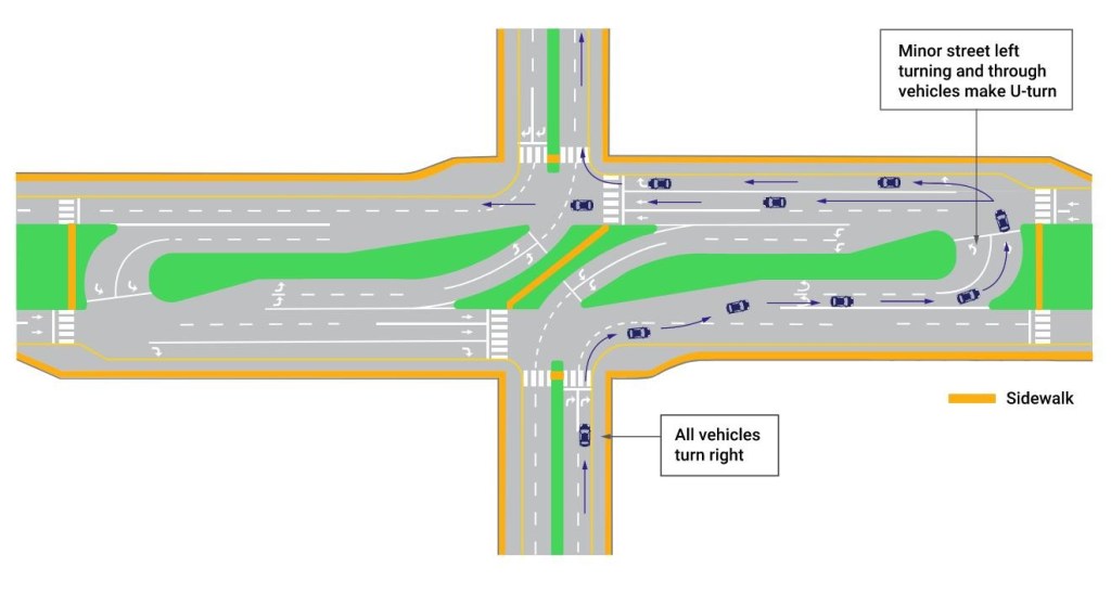Before and after studies of RCUT installations have shown a reduction in the rate, frequency, and severity of crashes. Traffic engineers commonly use a count of “conflict points” – where two vehicles merge, diverge, or cross – as one means of assessing safety. While a standard or conventional intersection has a total of 32 conflict points, an RCUT typically has only 14, implying a lower crash risk. Due to the geometry and median design of an RCUT, there are few direct crossings where conflicts can occur. Crash types linked to higher injury severity, like angle crashes, also tend to be reduced in an RCUT design because of fewer crossing conflict points.