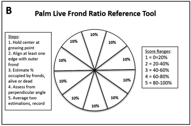 The research team also developed an efficient, peer-reviewed methodology to assess the health of palms. This is especially helpful for FDOT inspections, as it gives personnel some key indicators to look for in the field like canopy size and color. The project team further implemented this research by updating FDOT’s A Guide for Tree and Palm Maintenance Along Florida Roadsides to provide all the pruning basics for staff and contractors. This also included a contract specifications guide, covering 34 common pruning scenarios.
