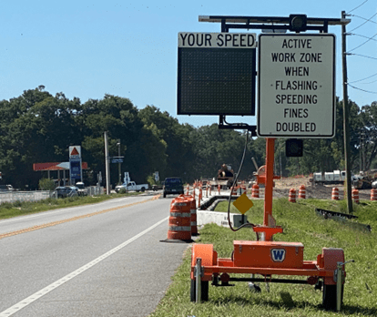 The deployment of AWADs could be a low-cost, effective, and innovative solution to improve arterial work zone safety. AWADs incorporate radar combined with flashing Light-Emitting Diode (LED) signs that (1) warn drivers of an upcoming active work zone with the presence of workers, (2) display drivers’ approaching speeds, and (3) warn drivers of “speeding fines doubled” (See Figure 1).